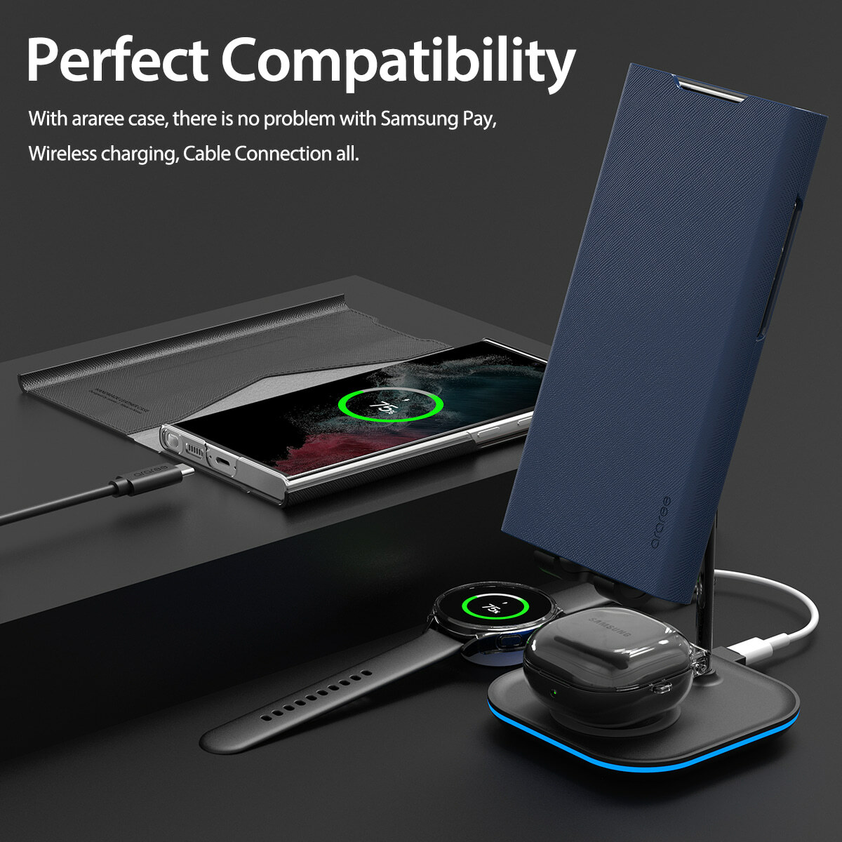 三星官方認證,高品質韓國製造及設計。優質手工 PU 皮革,帶內置支架及卡片位。磁石開關。內部透明硬質 PC 殼提供強力保護。兼容無線充電。