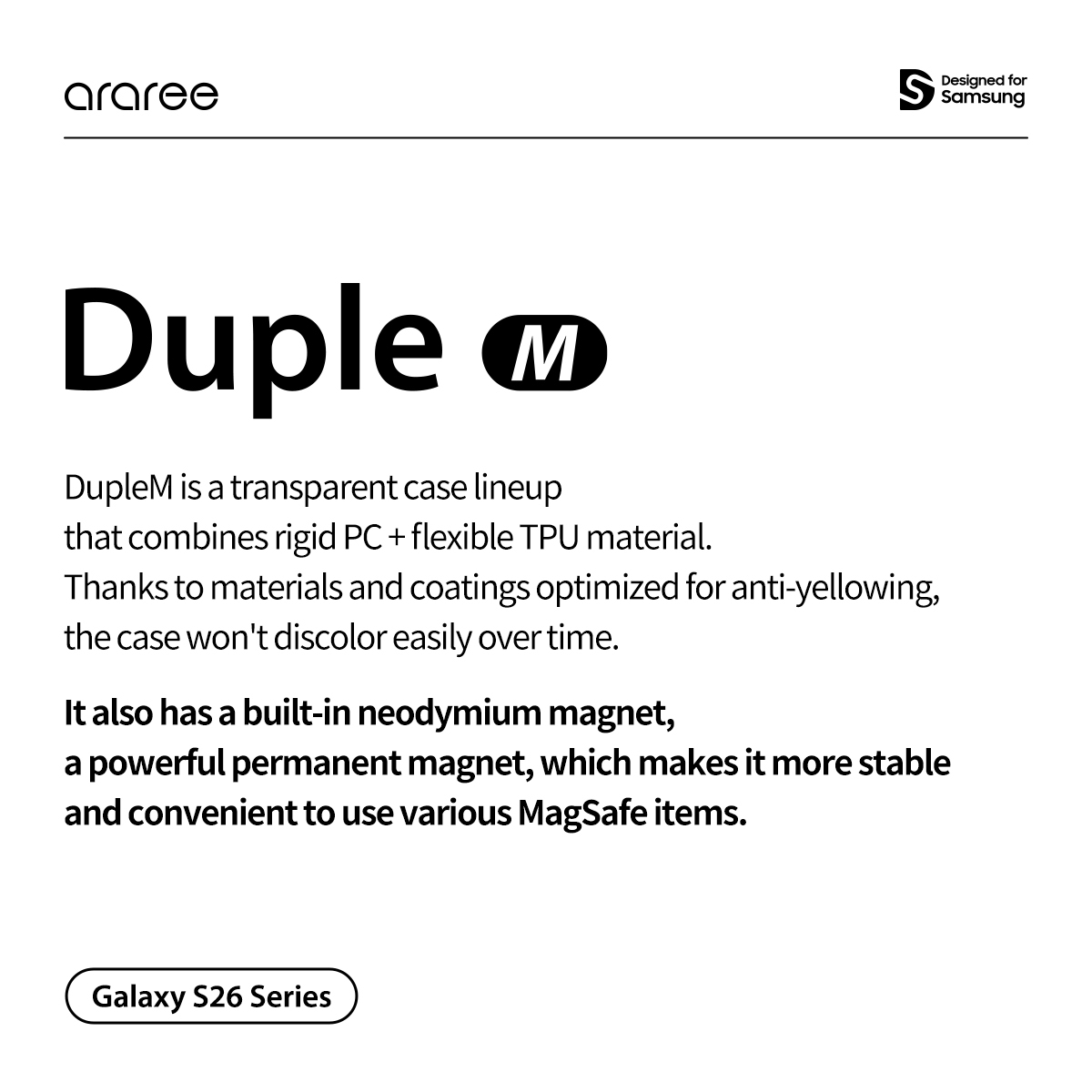 Araree Duple M 全透明混合結構防撞殼,適用 Galaxy S26 Ultra。香港行貨,軍規級防摔,支援無線充電,手感舒適,原機通透設計。香港及澳門免運費。