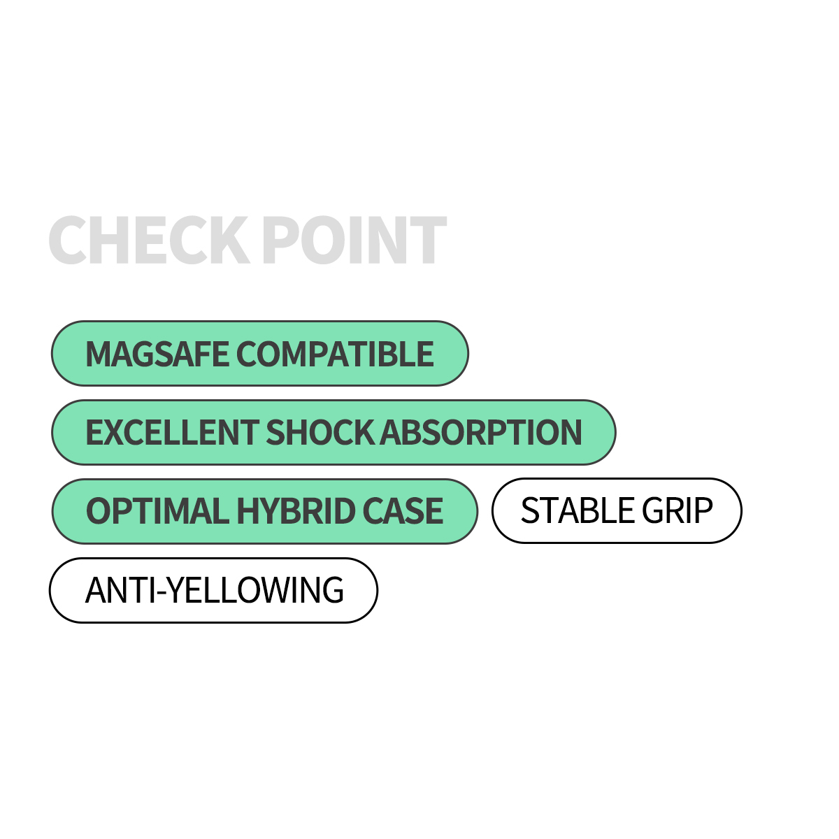 -混合物料製成 。對應MagSafe。減震邊框和堅硬的背板。簡約全透明外形 極佳手感。精準立體按鈕,出色的按壓回饋。達軍規級防摔標準。韓國設計