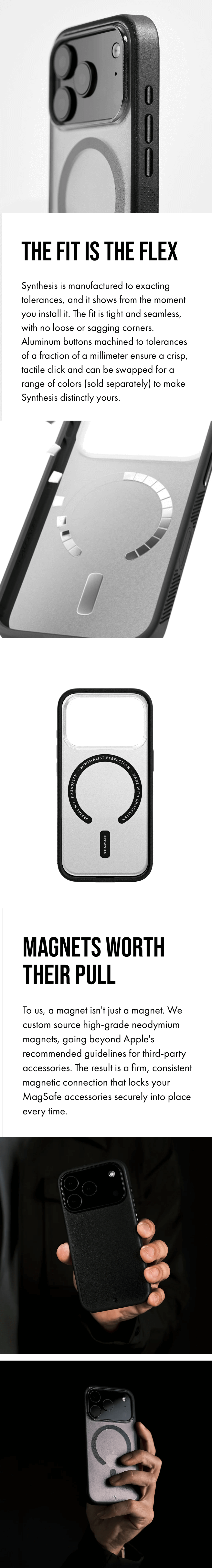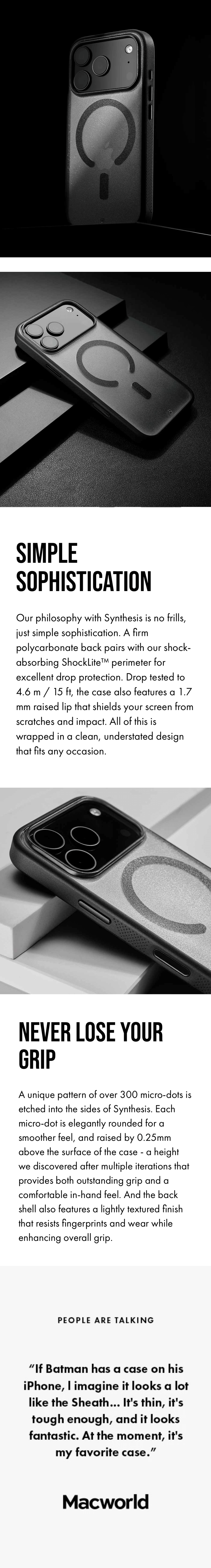 Caudabe Synthesis 以簡約美學打造,手感出色,提供穩固防滑握感及卓越吸震效果。極簡設計,通過 4.6 米 / 15 呎防摔測試。全面兼容 MagSafe 配件,並配備一體化相機控制按鍵。