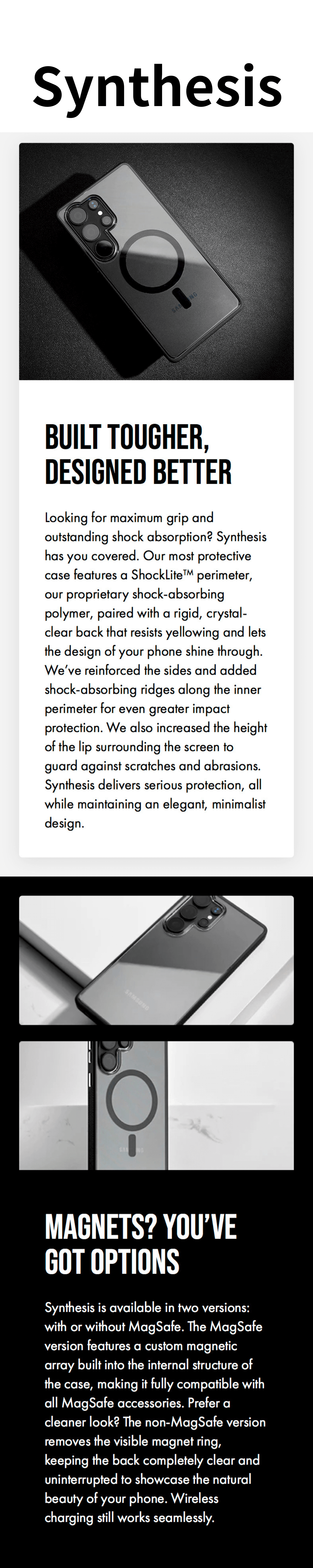 A:Synthesis 混合式設計,邊框採用ShockLite™ 特殊材質製成,輕薄且帶高延展性,用久不鬆弛。背面則配以特制磨砂質感硬背板,防滑不跣手。