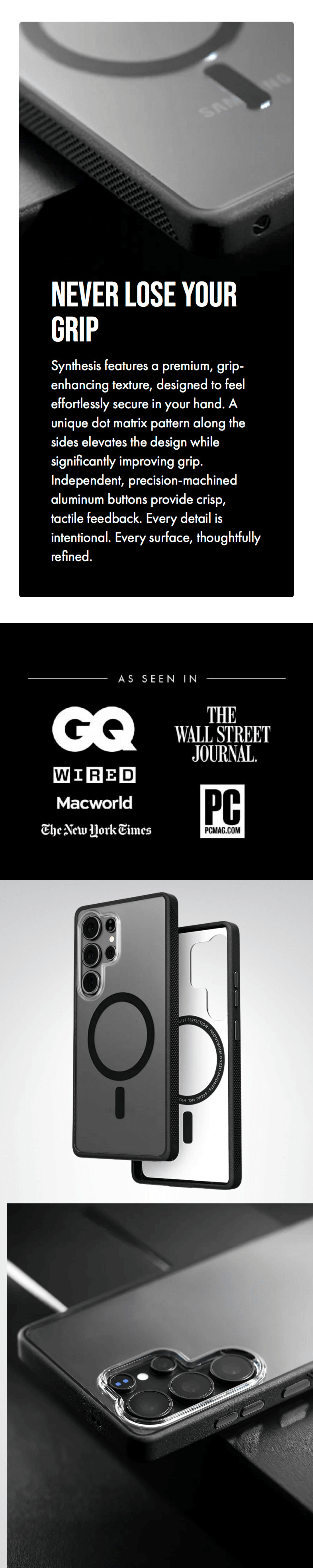 我們最具保護性的保護殼隨 Galaxy S25 Ultra 一起進入我們的三星產品線。 Synthesis 採用由我們專有的減震聚合物 ShockLite™ 製成的周邊,與堅韌、堅硬的後殼相結合,可提供強大的保護。毛絨超細纖維襯裡和精密加工、顏色匹配的鋁製按鈕提升了體驗。 香港地區通常一至三個工作天內送達。