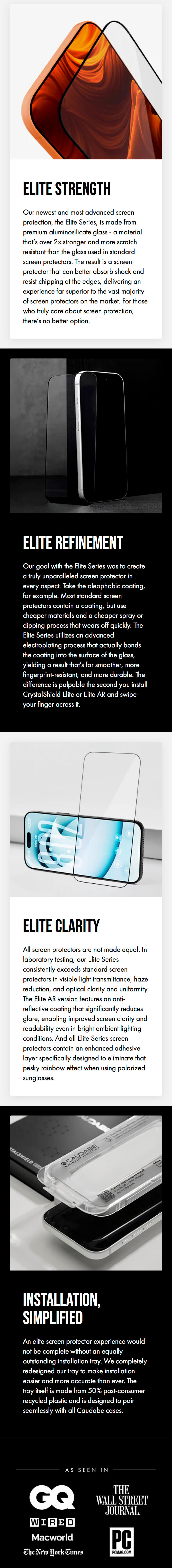 Caudabe 最新升級的螢幕保護貼——Elite AR,具備抗反射高清效果。採用高級鋁矽酸鹽玻璃製成,其強度超過一般螢幕保護貼 2 倍以上,抗刮性能更佳。先進的抗反射鍍膜可大幅降低眩光,即使在強光下也能保持清晰顯示。電鍍疏油塗層有效防指紋與污跡,搭配重新設計的安裝托盤,每次與 Caudabe 手機殼結合均能完美對齊。
