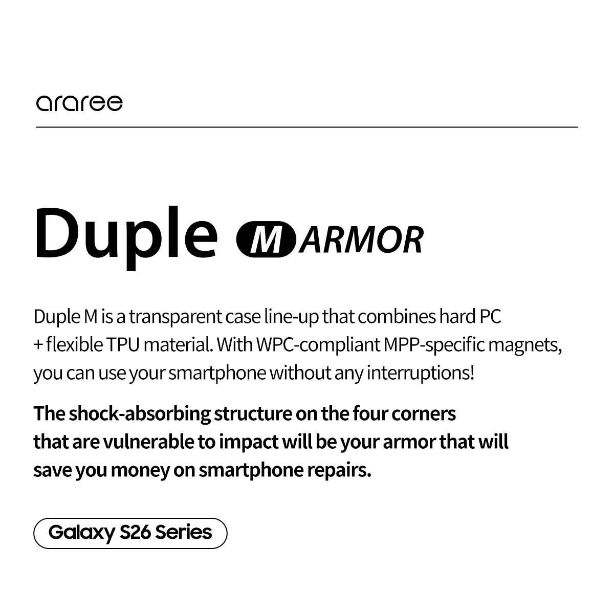 Galaxy S26 Plus 專用 Araree Duple M Armor 混合結構防撞殼,香港行貨,軍規防摔,精準按鈕,兼容無線充電,簡約透明設計。香港及澳門免運費。