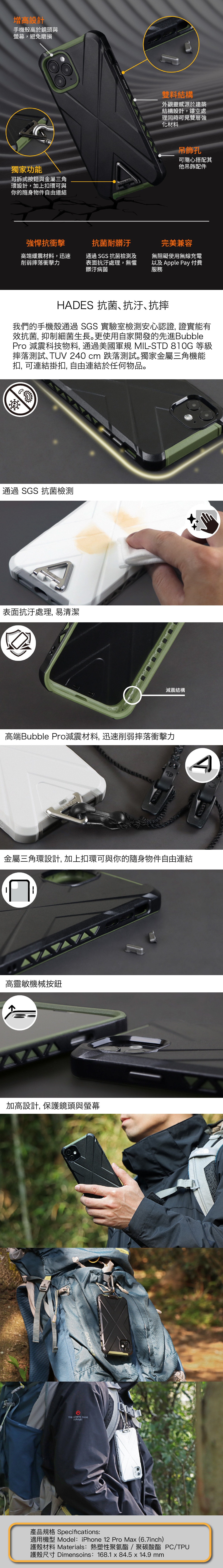此台灣設計手機殼通過 SGS 實驗室檢測安心認證,證實能有效抗菌,抑制細菌生長。更使用自家開發的先進Bubble Pro 減震科技物料,通過美國軍規 MIL-STD 810G 等級摔落測試、TUV 240 cm 跌落測試。獨家金屬三角機能扣,可連結掛扣,自由連結於任何物品。 對應無線充電。