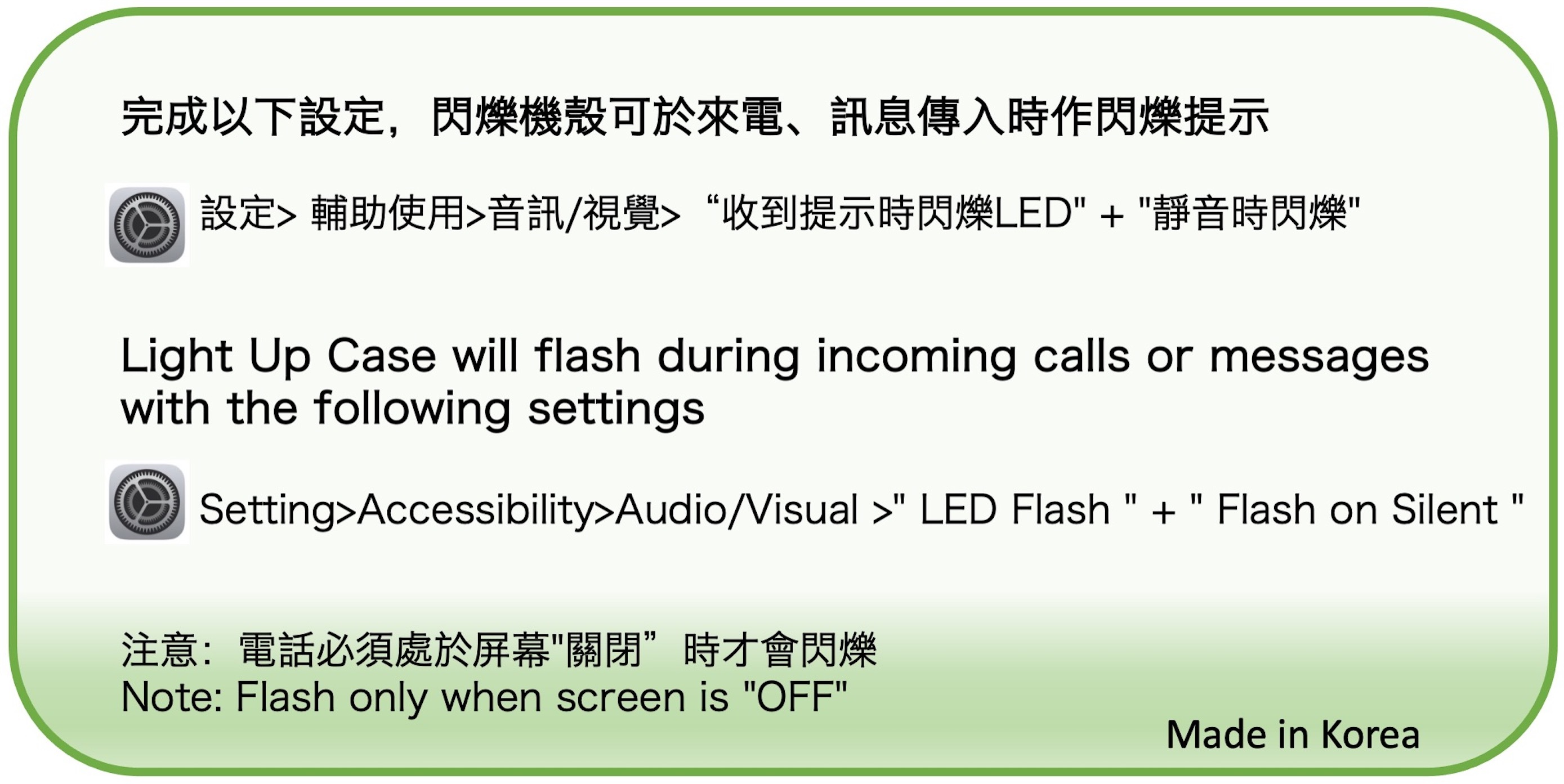 來電或訊息時閃燈提示。混合結構,防撞邊框配硬身背面。四角特設防撞氣囊,強勁保護。鏡頭覆蓋式設計,免受刮花碰撞。韓國製造。