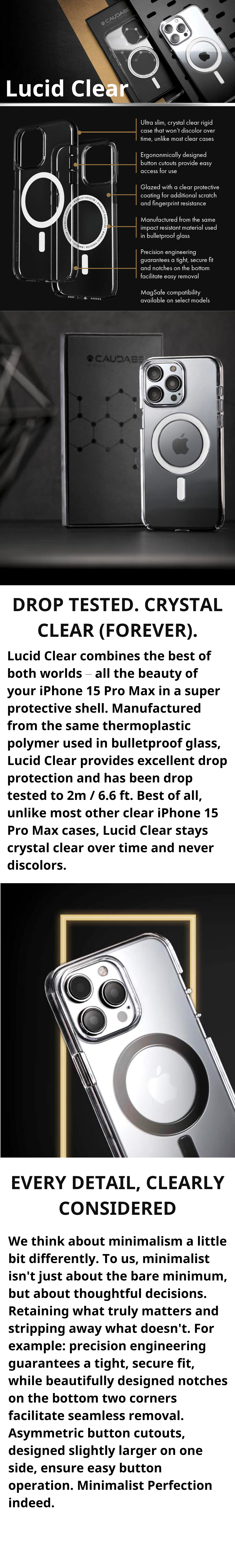 製作防彈玻璃時會於兩層玻璃中間加入特製的聚合物,阻擋子彈穿過。Lucid Clear 就是使用這種聚合物,機殼是硬身卻有比一般平價塑膠高的柔韌性,這樣使機殼保持輕薄且更耐用,不容易碎裂。