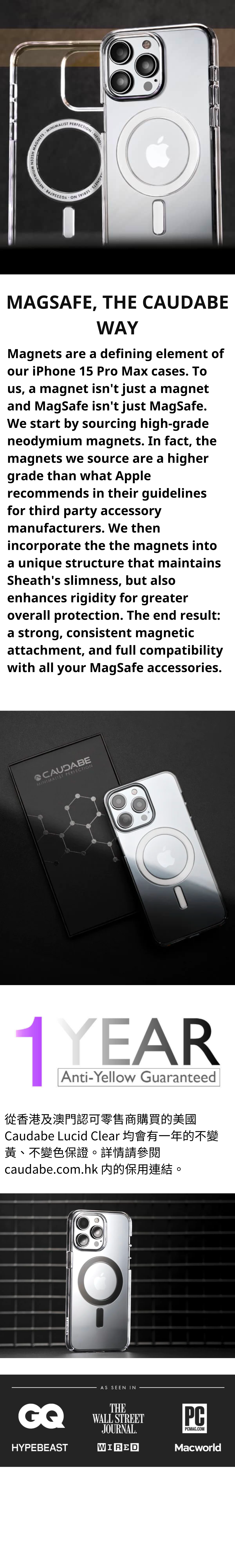 Lucid Clear 支援無線充電及100% 對應MagSafe 充電,包括 CarMount、懸浮式充電、 卡片套、 充電寶等等。 其他MagSafe型號可以考慮Caudabe 的 Sheath 及 Synthesis MagSafe 系列。