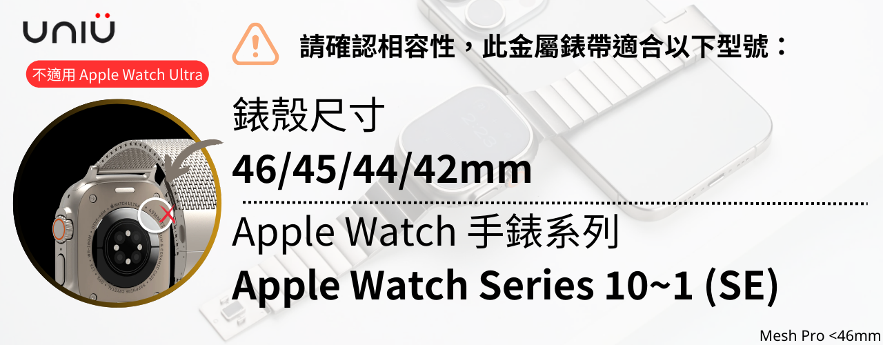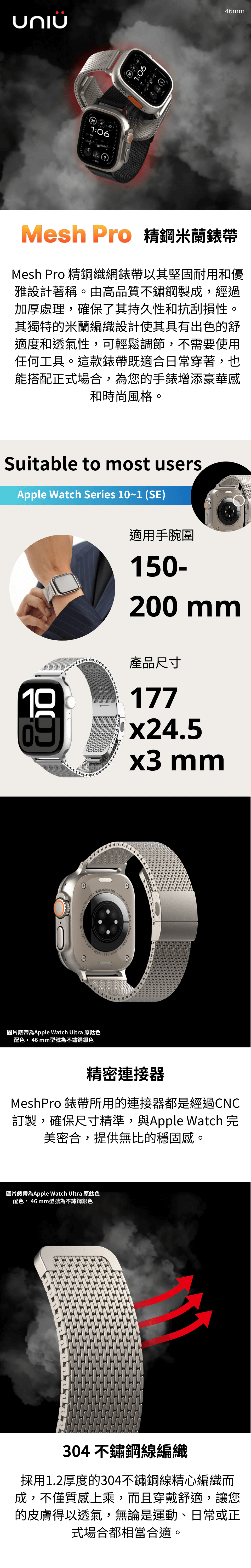 適合 Apple Watch Series 10~1 (SE) 45/44/42mm (mm) 錶帶由醫療級不鏽鋼製成,持久性和抗刮損性。米蘭編織設計可輕鬆調節大小,不需要使用任何工具。 編織設計,透氣輕巧, 不侷促。 運動時穿戴也不會侷促,亦不會沾上汗液產生異味。適合日常穿著,也能搭配正式場合,為您的手錶增添豪華感和時尚風格。