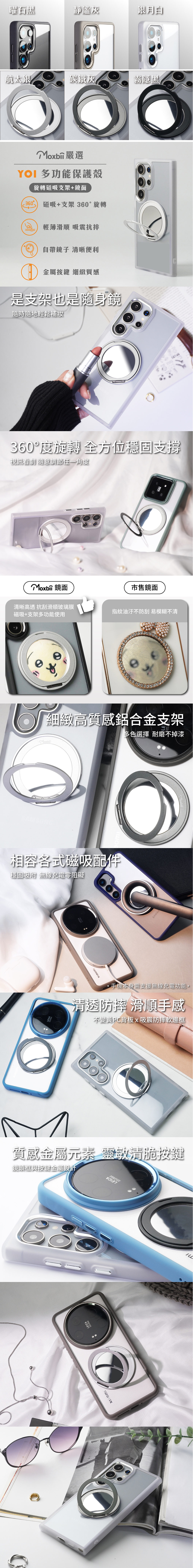 Moxbii YOI 系列手機殼於台灣製造,磁吸支架對應各種MagSafe 配件,能 360°旋轉,配備鏡面方便使用。邊框輕薄滑順、吸震抗摔、疏油塗層且不留指紋。配備。金屬按鍵 ,細緻質感。