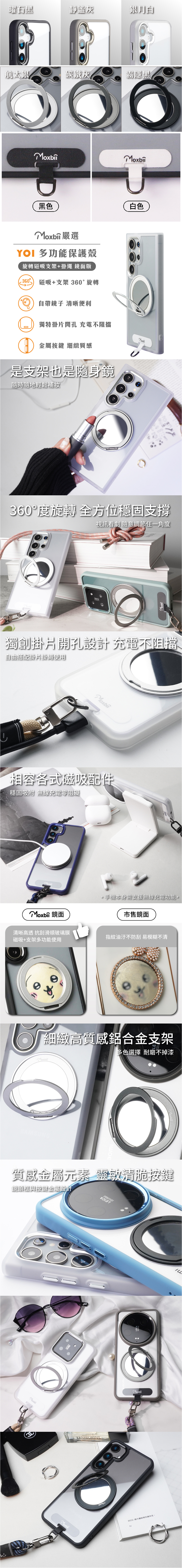 Moxbii YOI 系列手機殼於台灣製造,磁吸支架對應各種MagSafe 配件,能 360°旋轉,配備鏡面方便使用。獨立頸繩掛口 (附送黑白掛片各一)不會阻礙叉電線。邊框輕薄滑順、吸震抗摔、疏油塗層且不留指紋。配備。金屬按鍵 ,細緻質感。