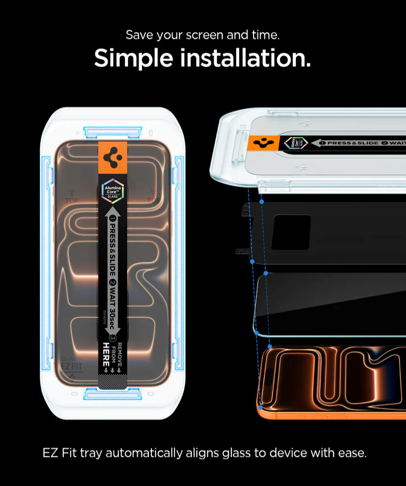 成為英雄,保護你的螢幕、防偷窺,也節省你的時間,EZ Fit 讓你以前所未有的方式為 iPhone 安裝螢幕保護貼,使用托盤對準保護貼,輕輕按下,就大功告成,簡單又輕鬆。