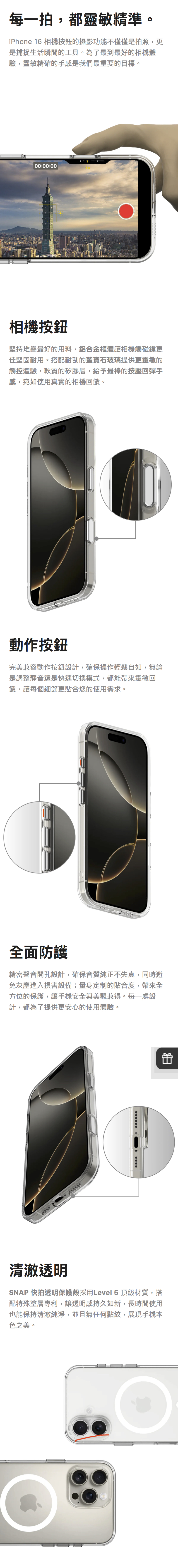 專為iPhone 16系列相機按鈕設計的MagSafe保護殼,搭配耐刮的藍寶石玻璃,提供更靈敏的觸控體驗。保護殼採用Level 5 頂級材質,搭配特殊塗層專利,讓透明感持久如新,長時間使用也能保持清澈純淨,並且無任何點紋,展現手機本色之美。